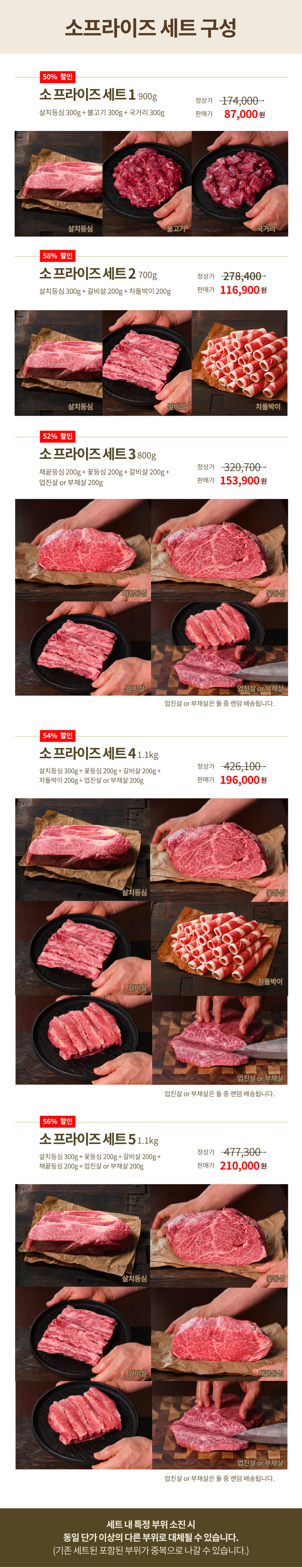 소(牛)프라이즈 세트5 - 살치등심 300g + 꽃등심 200g + 갈비살 200g + 채끝등심 200g + 업진살 or 부채살 200g (1.1kg)