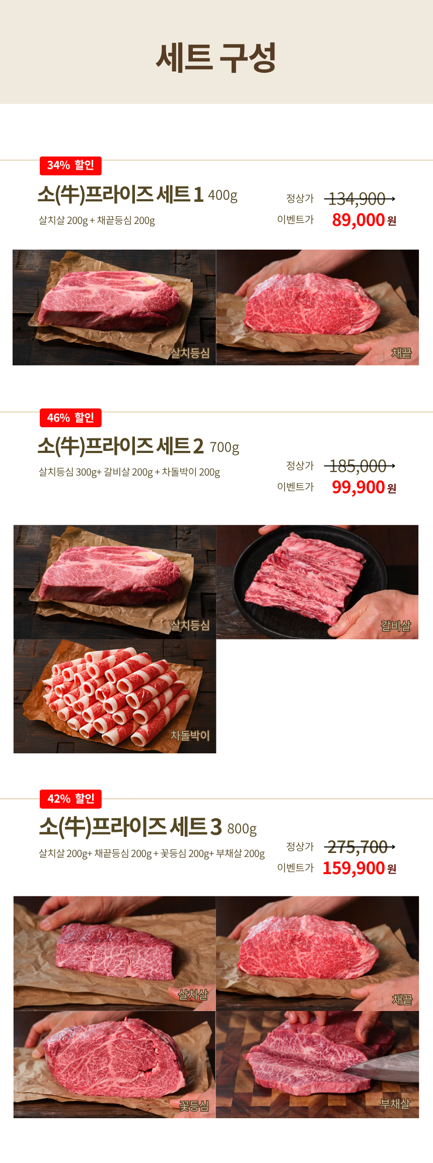 소(牛)프라이즈 세트2 - 살치등심 300g + 갈비살 200g + 차돌박이 200g (총 700g)